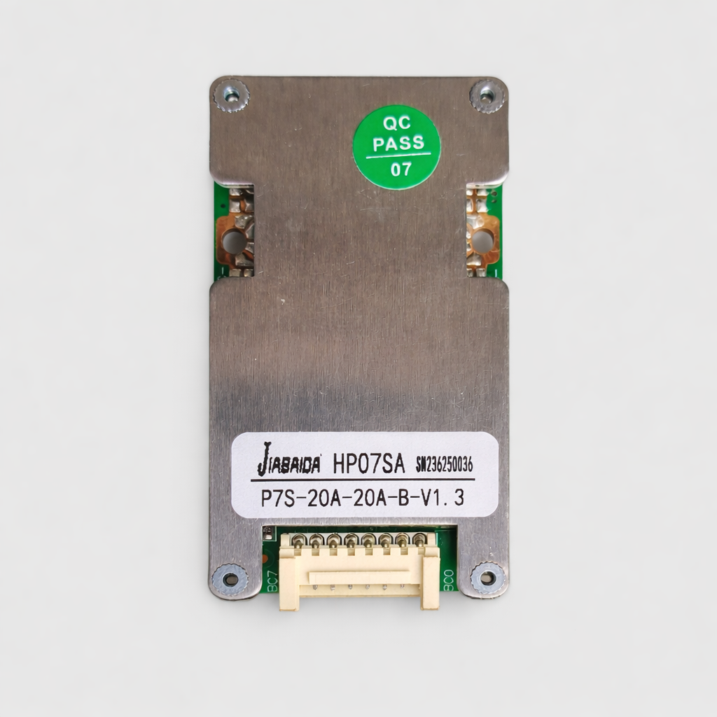 The Jiabaida (JBD) HP07SA 7S 20A BMS is a high-reliability Battery Management System designed specifically for 7S (7 cells in series) Lithium-ion / NMC battery packs with a nominal voltage of approximately 25.9V and a full charge voltage of 29.4V.
